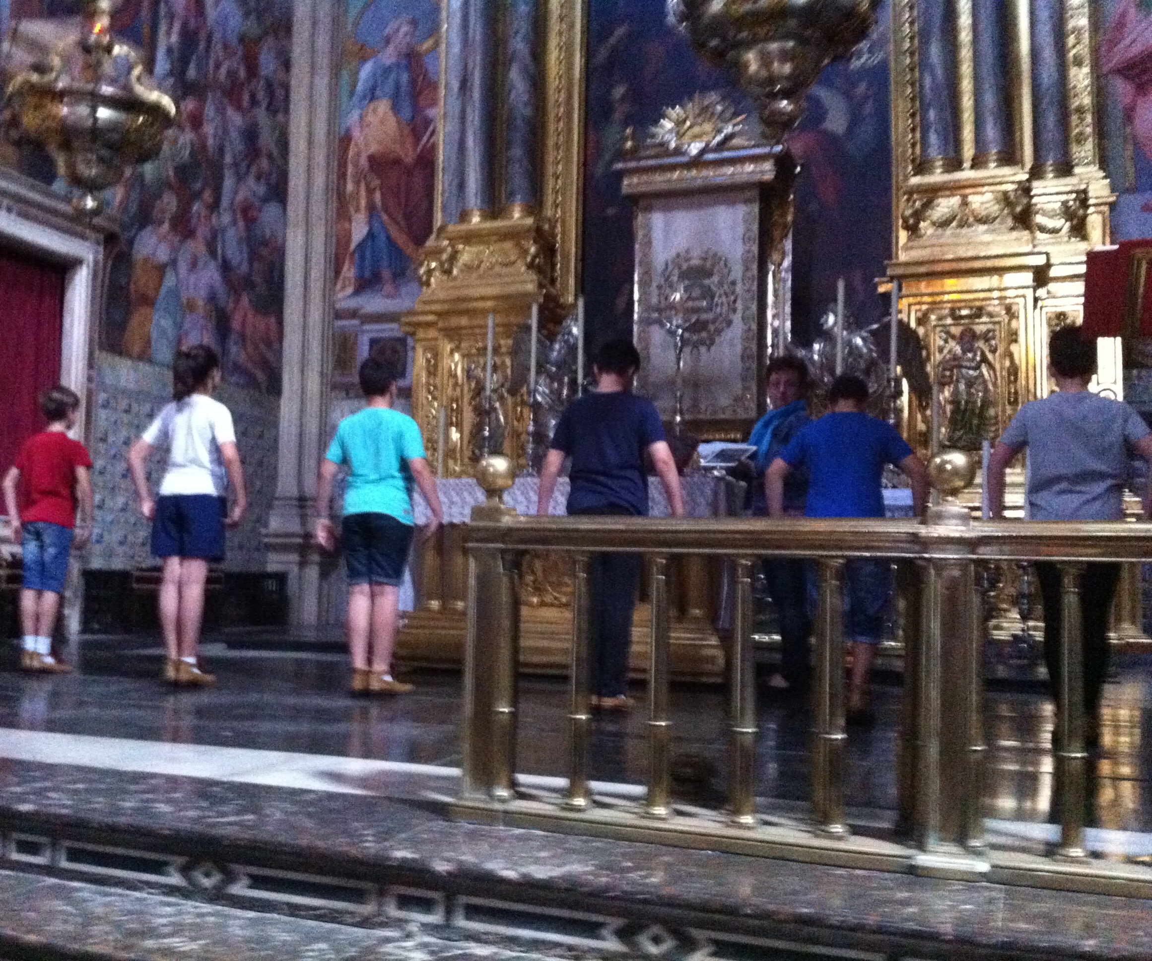Desarrollo de las Danzas: Desde mediodía [del Jueves, octava del Corpus] hay un grupo de soldados guardando el pretil de bronce del altar mayor para cerrar el paso a la gente que se arremolina para ver el comienzo de la procesión y de la primera danza que tiene lugar en el presbiterio … [Después] se organiza la procesión. Detrás de la cruz patriarcal van los capellanes y enseguida los frailes capuchinos con velas encendidas. Los jurados llevan el palio…