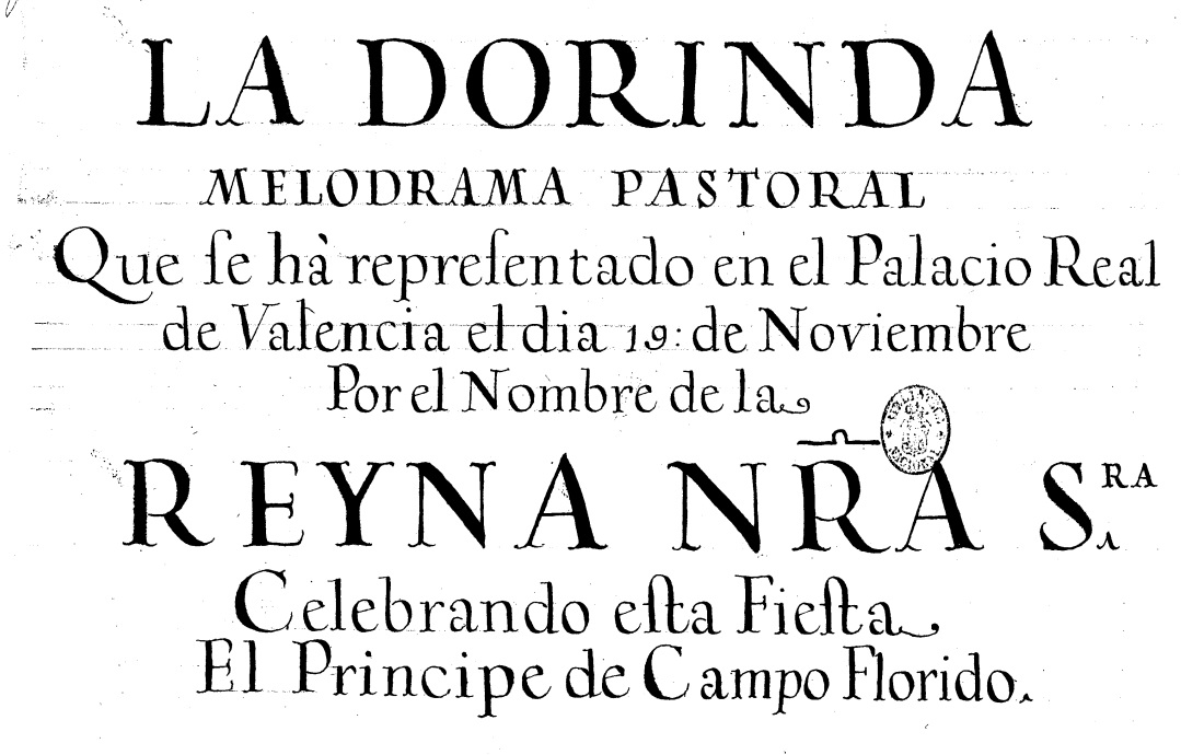 La Dorinda es etiquetado como un melodrama pastoral y sabemos por el ejemplar que guarda la Biblioteca Nacionalque se ha representado en el Palacio Real de Valencia el dia 19 de Noviembre por el nombre de la Reyna Nra. Sra., celebrando esta fiesta El Príncipe de Campo Florido”.