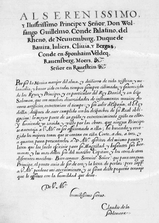 Se trata de una compilación realizada por Claudio de Sablonara, que fue copista o “puntador” de la Capilla Real entre 1599 y 1633. Dice el autor en la dedicatoria que realiza a Wolfgang Wilhelm, Conde de Neuburg y Duque de Baviera, que “ningún príncipe se aventaja a Vuestra Alteza en ser aficionado a ella [a la música] he buscado y recogido los mejores tonos que se cantan en esta Corte a dos tres y cuatro [voces] para presentarlos a Vuestra Alteza del mismo punto y letra que los suelo escribir para Su Majestad y Infantes”.